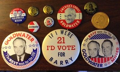 Title (ebay affiliate link): Great Lot of 9 Goldwater and Miller Presidential Campaign Pinbacks and 1 "Coin."