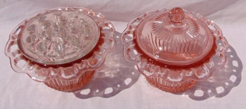 Title (ebay affiliate link): Colony Open Lace Pink Depression Candy Bowl w/ Lid, Flower Frog Vase 2pc