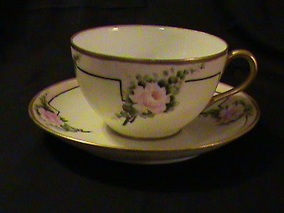 Cup and Saucer Set Hand Painted Nippon Pink Flowers Edged in Gold collectible gi