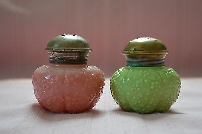 ANTIQUE PRETTY PINK/GREEN GLASS REPOUSSE FLOWER PANELS SALT & PRPPER SHAKER
