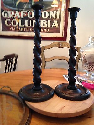 ANTIQUE ENGLISH OAK BARLEY TWIST CANDLE STICKS HOLDERS 15 1/2" TALL