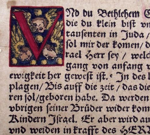 Title (ebay affiliate link): 1549 LUTHER Bible LEAF - WOODCUT PUTTI 4 INITIALS ORIGINAL - MICHAEL
