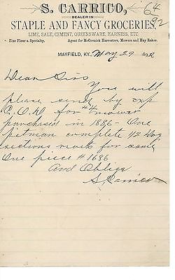 1892 S CARRICO STAPLE & FANCY GROCERIES AGENT McCORMICK HARVESTERS MAYFIELD KY