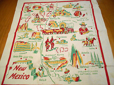 1950s NEW MEXICO MAP 29x37 BARK CLOTH TABLECLOTH - SILVER CITY, SANTA FE, etc