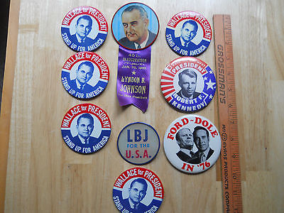 9 Large Campaign Buttons. LBJ, Ford, Wallace, Robt Kennedy.