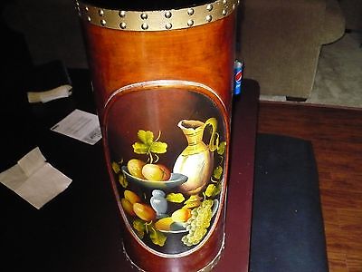 Title (ebay affiliate link): Round Wood Umbrella Stand 24" ht x 10" dia Fruit Hand Painted Inlay