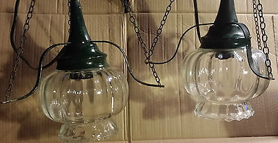 VINTAGE TWIN PENDANT GLOBE LIGHTS CHAINS ON THREE PRONGS RIBBED GLOBES