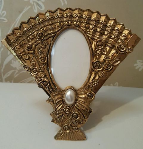 Title (ebay affiliate link): Vintage Ormolu Gold Metal Filigree Roses & Pearl Fan Shaped Picture Frame Vanity