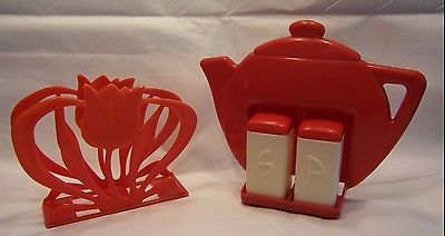 Title (ebay affiliate link): Vintage Red Teapot Salt & Pepper Shakers Napkin SUPERLON Plastic Kitchen Kitsch