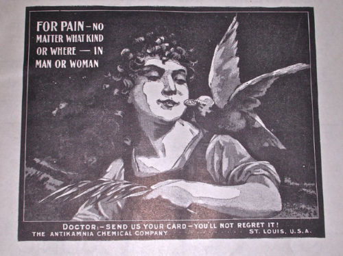 Title (ebay affiliate link): 1900 Victorian Pain Killer Ad ANTIKAMNIA Girl with Dove PATENT MEDICINE
