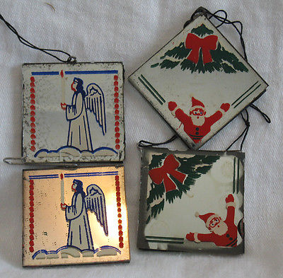 Title (ebay affiliate link): 4 Antique Christmas Ornaments Painted Mirrors Santa, Angel, Tree 1 5/8" Square