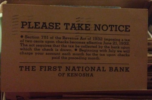 Title (ebay affiliate link): Vintage Tax Notice Postcard First National Bank Of Kenosha, Wisconsin 1932
