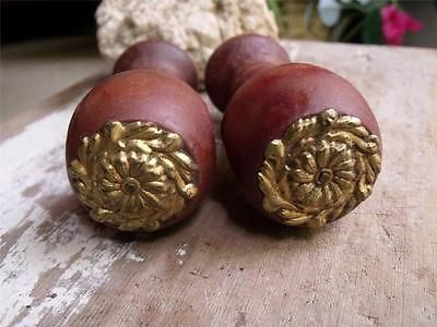 2 Primitive Antique 19th Century Curtain Rod Holders Turned Wood Brass Rosettes