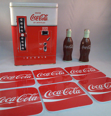 Title (ebay affiliate link): Coca-Cola Tin Bottle Vending Machine Replica w Salt n Pepper Shakers n Coasters