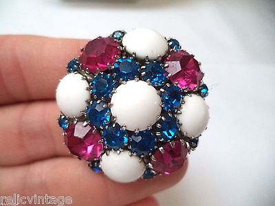 STUNNING VINTAGE UNSIGNED WEISS MILK GLASS PINK BLUE RHINESTONE BROOCH!!! 746A