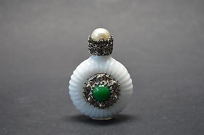 Title (ebay affiliate link): Vtg Czech mini perfume bottle milk glass green stone glass dauber
