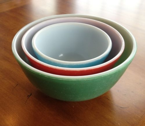 Title (ebay affiliate link): Vintage PYREX Set 3 PRIMARY COLORS Nesting MIXING BOWLS Stacking lot MILK GLASS