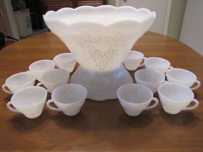 14-PCS.VINTAGE ANCHOR HOCKING MILK GLASS PUNCH BOWL SET