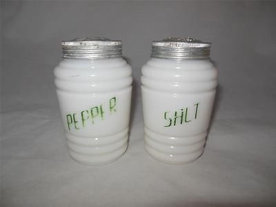 Vintage Pair of Milk Glass Ribbed Salt and Pepper Shakers Green Lettering