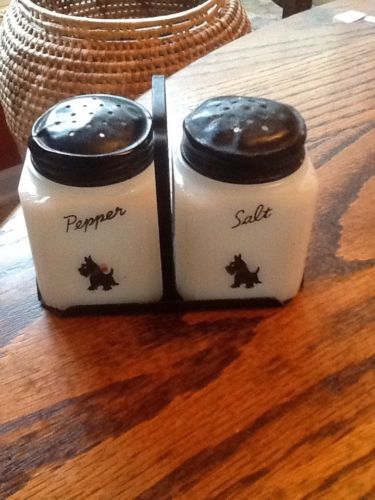Title (ebay affiliate link): Tipp milk glass Salt Pepper shaker w/ carrier Set~Scottie Dogs design~