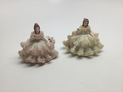 ANTIQUE SET - 2 MINI "LADIES SITTING IN CHAIRS" DRESDEN LACE FIGURINES GERMANY