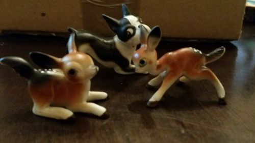 Set of 3 minature figuerines. Baby deers and Boston terrier 1950's