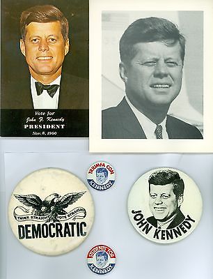 4 Vintage 1960 1964 John Kennedy Political Pinback Buttons & 1 Photo Postcard