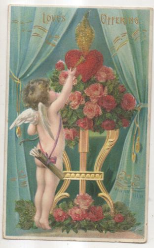 Title (ebay affiliate link): Love's Offering, Embossed Cupid with Flowers, Valentines Day Postcard