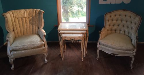 Title (ebay affiliate link): Vintage Mid Century French Bergere Wood Carved Wing Chairs and HP Nesting Tables