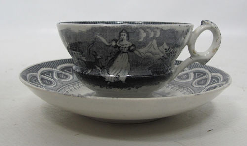 Early 19th C Antique Black White Transferware Girl w Sheep Tea Cup Saucer yqz