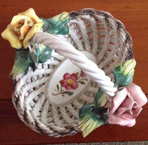 Title (ebay affiliate link): NUOVA CAPODIMONTE ITALY RETICULATED WOVEN FLOWER BASKET PINK ROSES