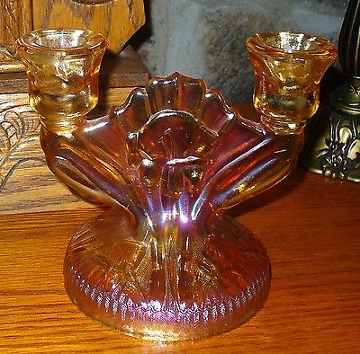Title (ebay affiliate link): VTG JEANETTE GLASS IRIS & HERRINGBONE IRIDESCENT MARIGOLD DOUBLE CANDLEHOLDER