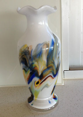 VASE - WHITE MILK GLASS w MULTI-COLOURED OPALINE SWIRLS & SCALLOPED TOP.VINTAGE