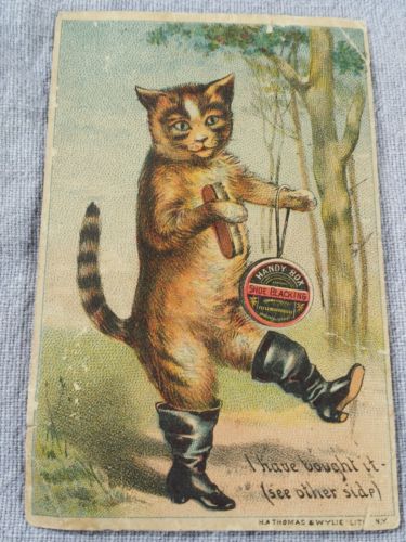 Title (ebay affiliate link): Handy box shoe blacking Trade card with a cat and boots very old vintage card