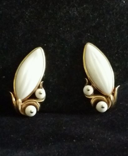 Title (ebay affiliate link): VINTAGE ESTATE CROWN TRIFARI GOLD TONE POURED MILK GLASS BEADED CLIP EARRINGS