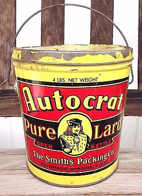 Title (ebay affiliate link): VTG Antique Metal AUTOCRAT Pure Lard 4 lb Tin w/lid & Handle Colo.Springs COLO