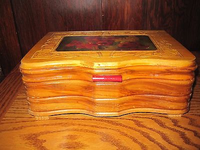EARLY VINTAGE ANTIQUE CARVED FLORAL WOODEN JEWELRY BOX-LITHO SCENE-MIRRORED LID