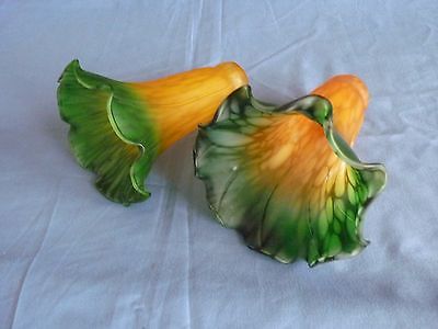 Two Glass Fluted Lily Tulip Amber&Green Lamp Shade Vintage.