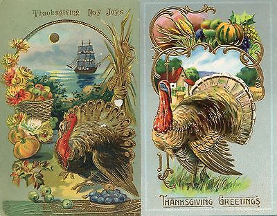 2 vintage embossed Thanksgiving postcards, Large Turkeys, Home, Ship, pumpkin