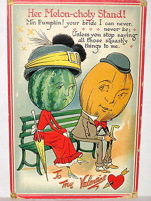 Title (ebay affiliate link): 1911 TUCK POSTCARD HER MELON-CHOLY STAND, MELON HEAD & PUMPKIN HEAD