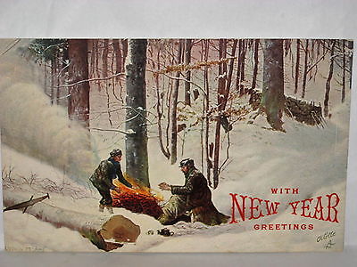 1910 TUCK POSTCARD WITH NEW YEAR GREETINGS, LUMBER JACKS WARMING BY FIRE