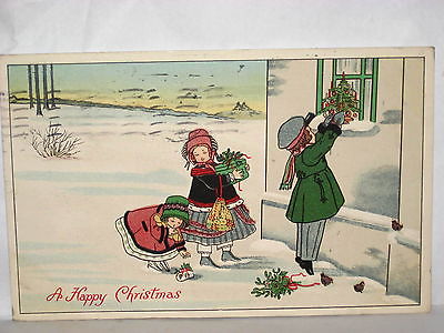 1912 POSTCARD HAPPY CHRISTMAS, CHILDREN PUTTING TREE IN WINDOW