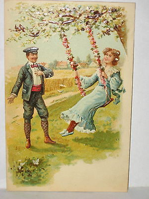 1910 POSTCARD MAN WATCHING WOMAN ON FLORAL SWING