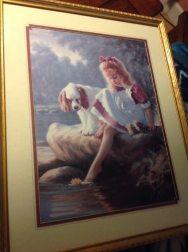 Title (ebay affiliate link): VINTAGE HOME INTERIORS CHILD GIRL PICTURE WITH DOG AT POND MATTED GOLD FRAME