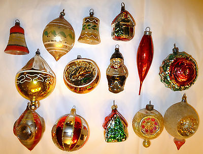 COLLECTION OF 14 VERY OLD ORNAMENTS CHUBBY BOY ROSE BELLS EGGSHELL HOUSES SPIRE