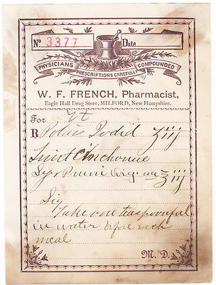Antique Handwritten Prescription, W. F. French, Pharmacist Milford, N.H. 1880's
