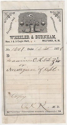 Title (ebay affiliate link): Wheeler & Burnham Druggists and Apothecaries Prescription, 1878 Milford, N.H.