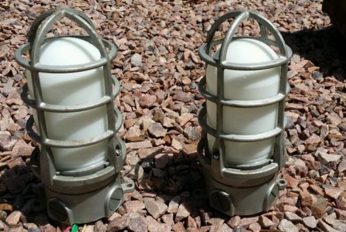 Lot of 2 Vintage Explosion Proof Lights with White Milk Glass & Cage Guards