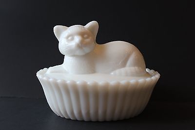 Title (ebay affiliate link): Vintage Westmoreland Milk Glass Cat on a Basket Candy Trinket Dish
