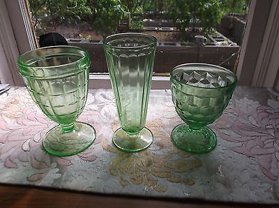 Title (ebay affiliate link): Three Radium Green Depression Glass Footed Tumblers